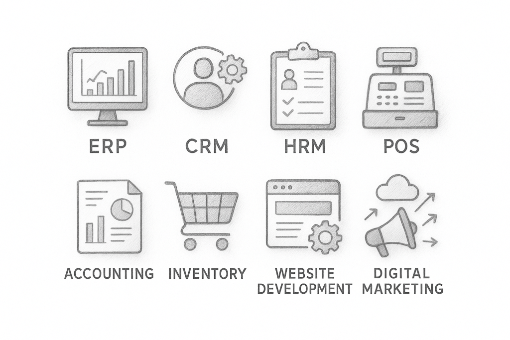 - ERP & CRM Solutions – Manage finance, inventory, customers & operations